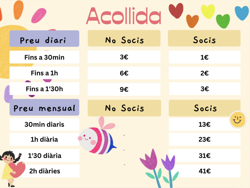 Preus acollida. Fins a 2 hores diàries en servei de tarda tindrà un cost de 41 €